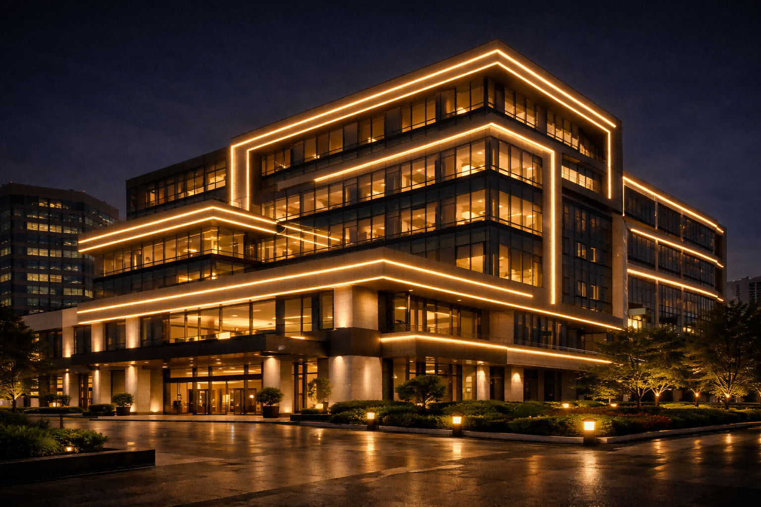 Linear lighting allows designers to emphasize architectural geometry with continuous lines of light. Compared with floodlights, linear fixtures provide better optical control, reduced light spill, and improved visual clarity for façade materials and structural rhythm.